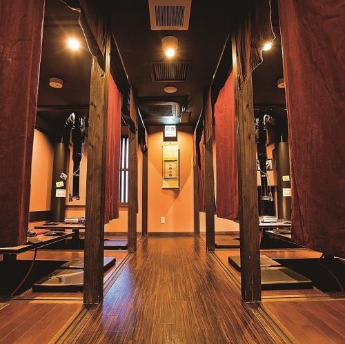 明るい照明が心地よい店内は、深みのあるカラーで統一されたシックなデザインが魅力です。全席個室のフロアは、テーブル席と掘りごたつ(お座敷)を完備しており、プライベート感あふれる空間が広がります。お食事から大人数の宴会まで、様々なシーンに対応できる柔軟性があり、ゆったりとした時間を楽しむことができます。
